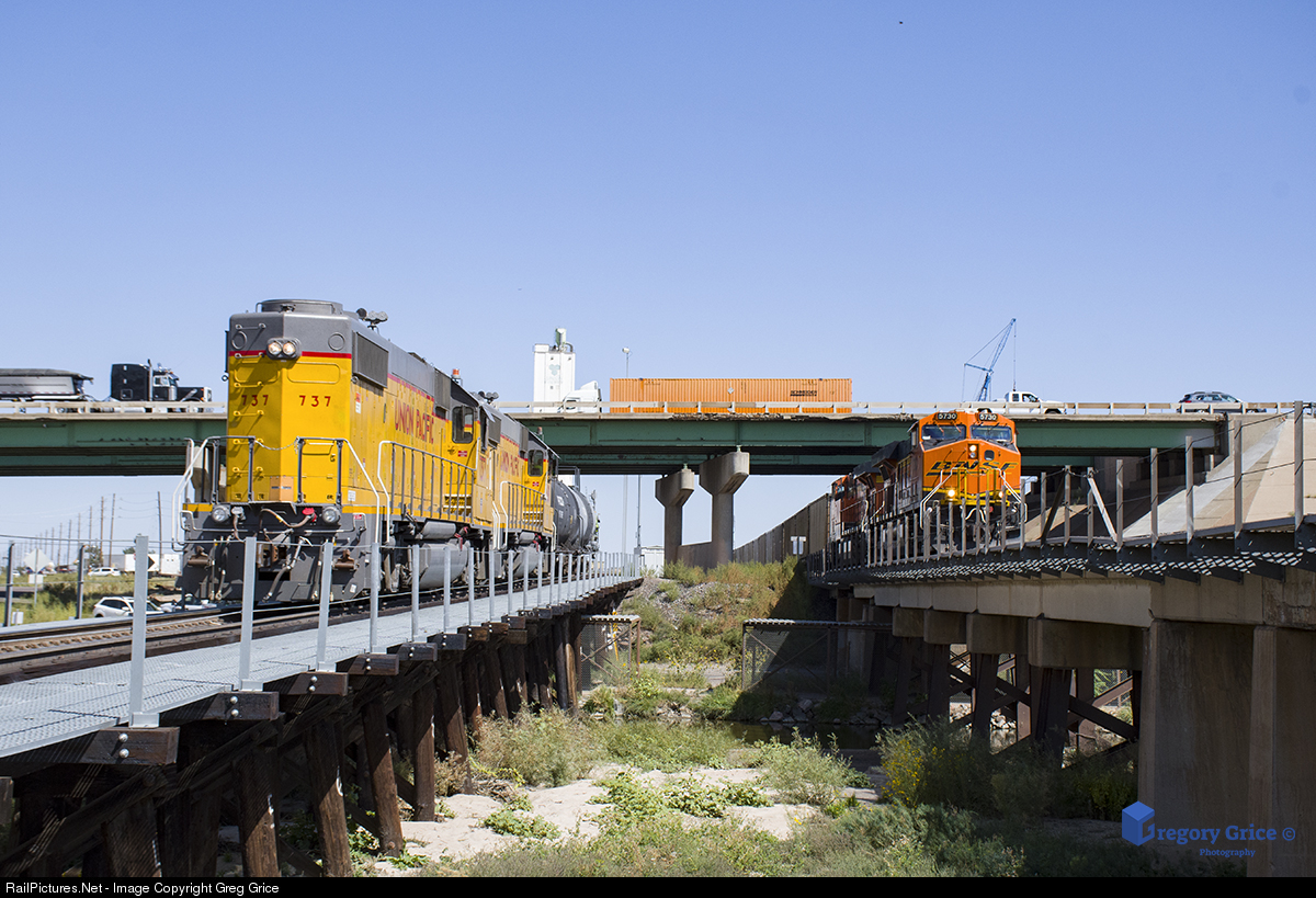 A Union Pacific local shoves empties from Suncor Energy back to the yard while a BNSF road train passes by on the adjacent Brush Subdivision. The Suncor's Denver location is a huge refinery that is served by both BNSF (Brush Subdivision) and Union Pacific (Greeley Subdivision) via various gates around the property. |