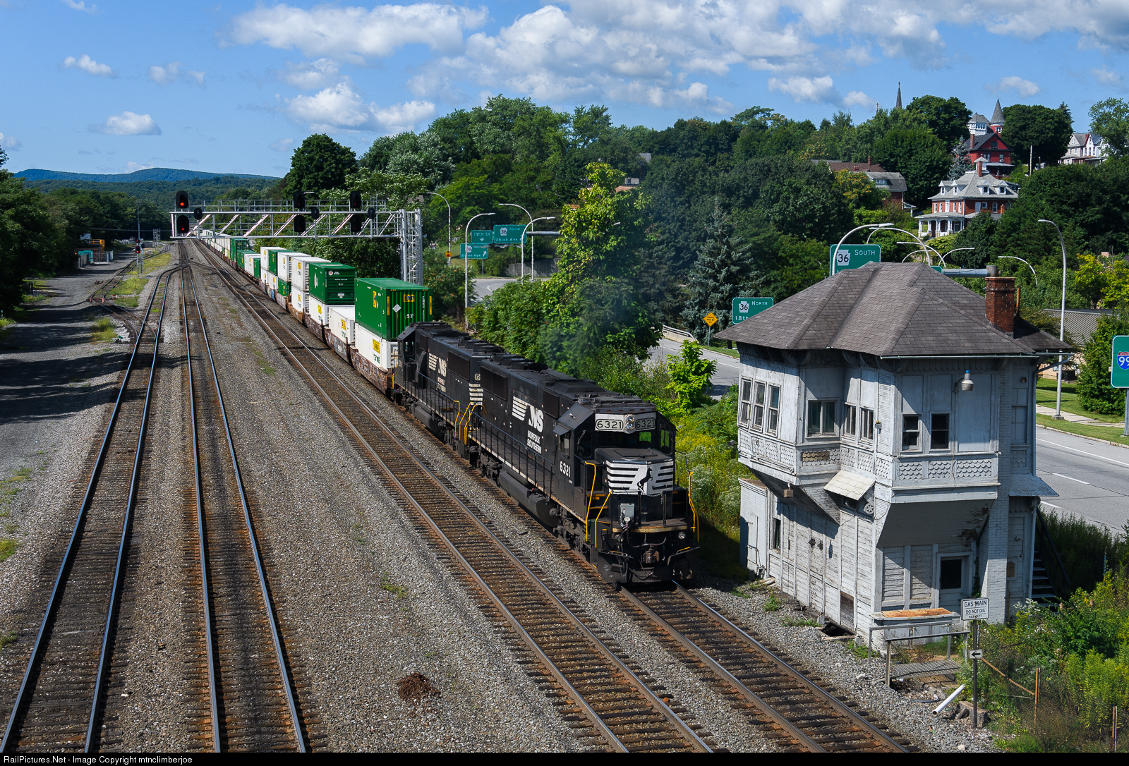 | A pair of SD40E helpers are shoving on the rear of westbound NS intermodal 25V as the trains heads out of Altoona, passing the tower that once controlled this interlocking. These helpers were added on to the train here in Altoona to assist the train over the Alleghenies. |