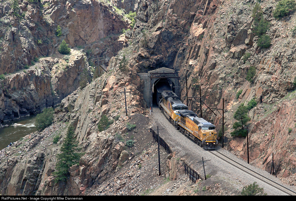 A Union Pacific coal train is eastbound in Little Gore Canyon east of Azure, Colorado, on June 6, 2013. The train is exiting 63-foot Tunnel 40, the shortest tunnel on UP’s Moffat Tunnel Subdivision.