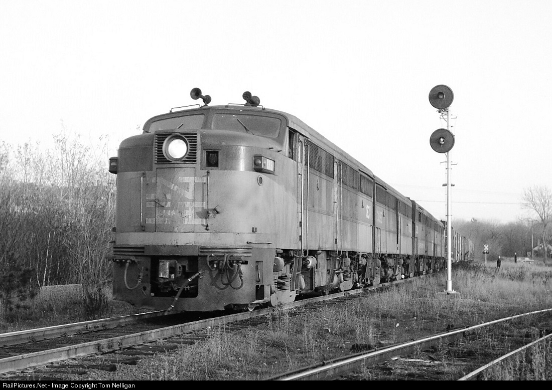 An A-B-B-A set of former New Haven Alco cab units storms through Medfield Junction, MA, with Penn Central train BL-1. This job running from the NH's South Boston yard to Lowell, MA, via Walpole and Framingham was a railfan favorite at the time thanks to the regular assignment of these classic Alcos.