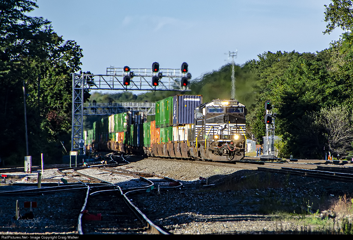 Rolling downgrade into Cresson, Pennsylvania, is a Norfolk Southern intermodal train powered by ES44AC 8007 and SD70ACC 1806. This train is passing under fairly new signals, which replaced the ancient Pennsylvania Railroad position-light signals that were a trademark of the NS's Pittsburgh Line for decades. (September 18, 2019)