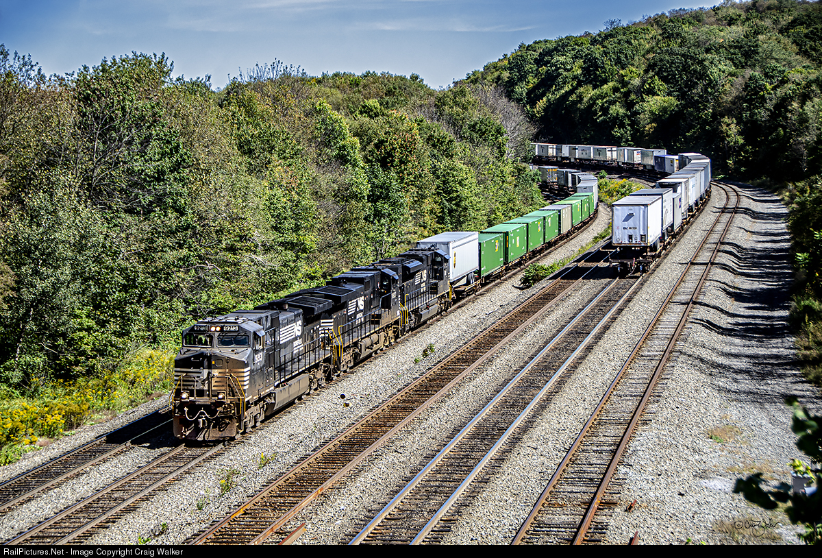 | A westbound Norfolk Southern intermodal train has begun its decent down the railroad’s West Slope of the Pittsburgh Line as it approaches Cresson, Pennsylvania, on September 18, 2019. A pair of Dash 9-44CWs (NS 9213 - with a dirty nose - and 9807) are teamed with SD70ACe 1121 are handling this train without any helpers on the rear. |
