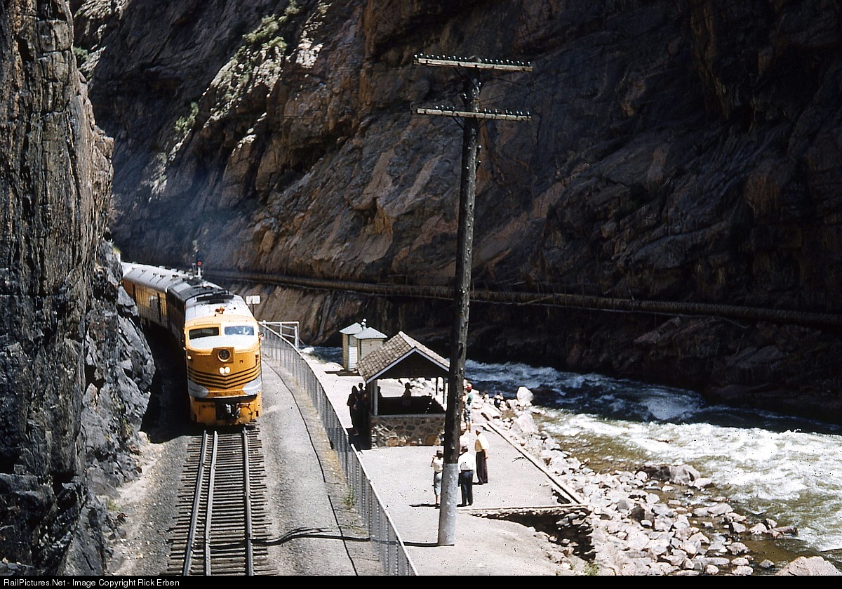 I was just a kid and using my father's Voigtlander camera on occasion. We were fortunate to see Rio Grande No.1, the "Royal Gorge", as it made its scheduled stop in the depths of the Arkansas River canyon, circa summer of 1960. As this picture illustrates, Rio Grande went "Through the Rockies, not around them", and the Grande did it in style.