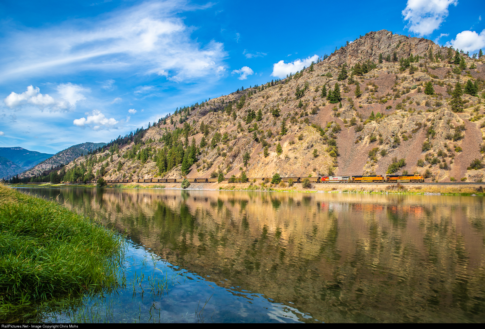 | Eastbound BNSF No.9315 with a Warbonnet in the headend lineup rolls an empty coal train along the Flathead River. Coal trains make up a large part of the movements on the MRL 4th and 10th subdivisions. Empty's move eastbound while loads move westbound. |