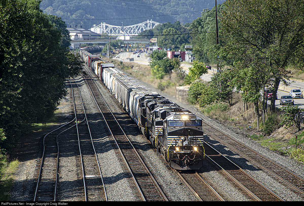 Just south of Ambridge, Pennsylvania, is the town of Leetsdale. Norfolk Southern train 10G has just departed Conway Yard and is heading east to Enola PA on September 21, 2019. NS ES44DC 7688 is leading a consist that also includes SD70ACU 7292 and ES44AC 8159.