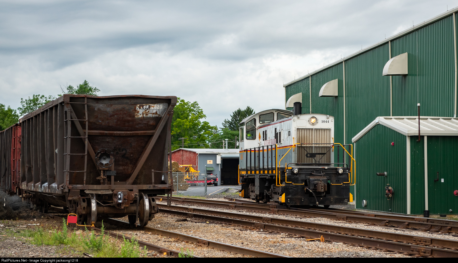GVT alco S6 number 1044 slowly moves out of the engine house in Batavia NY to start a morning of switching, passing loaded scrap cars spotted at the transload track.