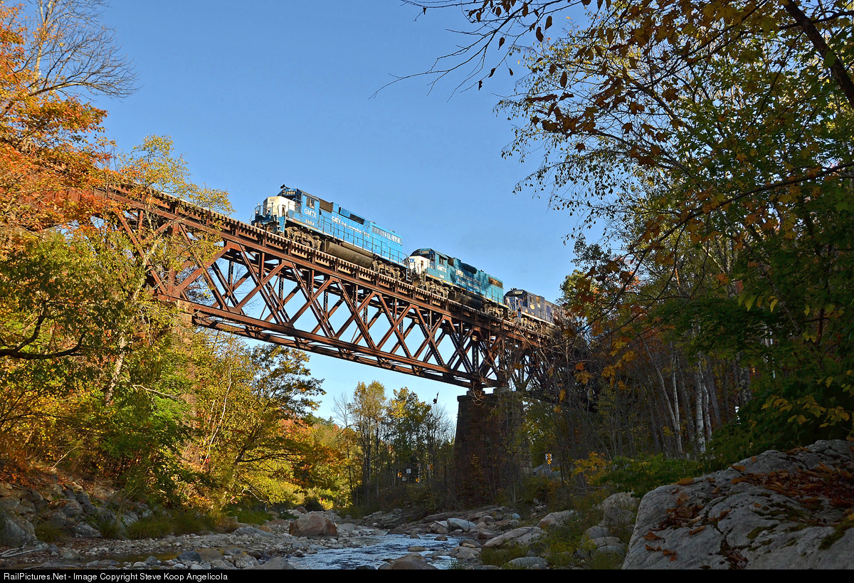 GMRC 263 is crossing the iconic Cuttingsville trestle with a four pack of EMD Geeps on a perfect October morning in Vermont.