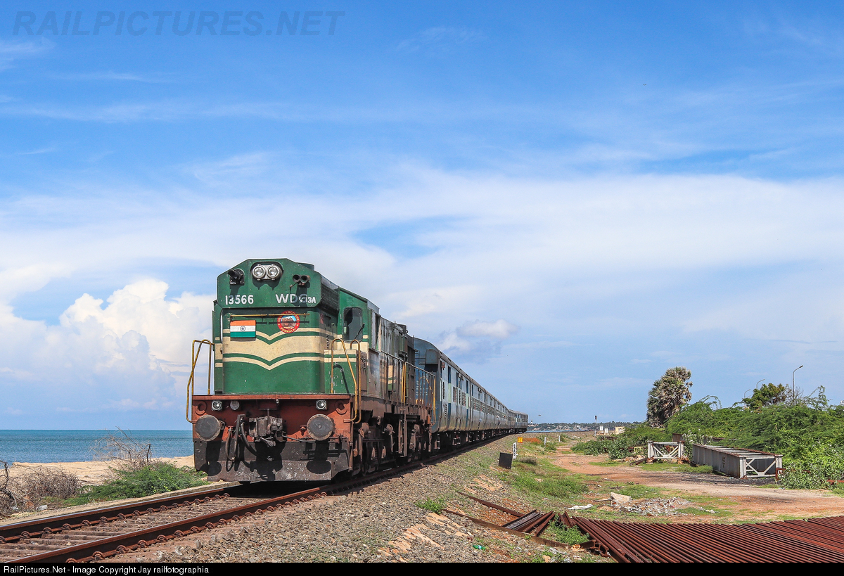 After crossing Bay of Bengal sea, Tiruchirapalli Jn bound passenger powered by PONMALAI WDG-3A moves along the beach to Mandapam