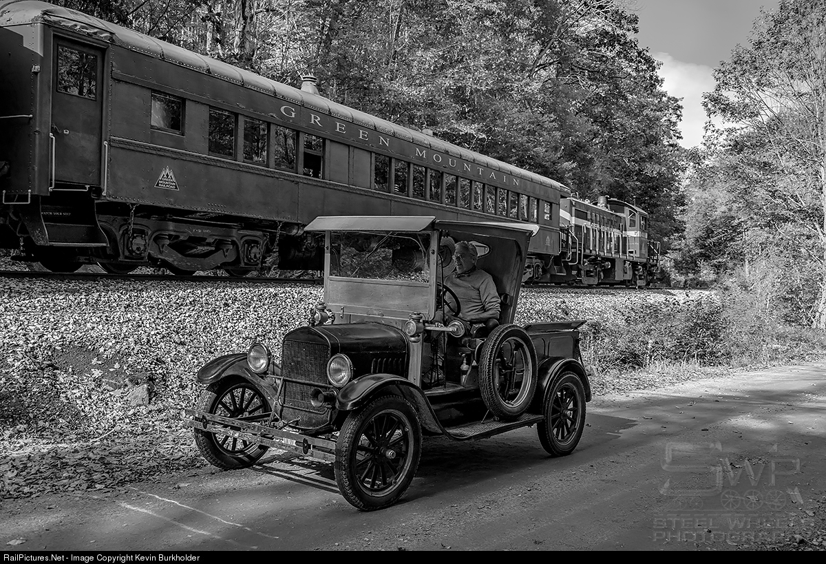 | With the last forecast sunny day and peak foliage abound in the Green (not so Green) Mountains, it was an excellent day for the GMRC Passenger Services Foliage Extra to be on the rails. A local resident in Cavendish that owns a 1926 Ford truck was a willing participant in a staged shot alongside the original Rutland Alco RS-1 #405, turned Green Mountain Railroad. The two antique vehicles made a side-by-side meet in the Cavendish Gulf on October 8. |