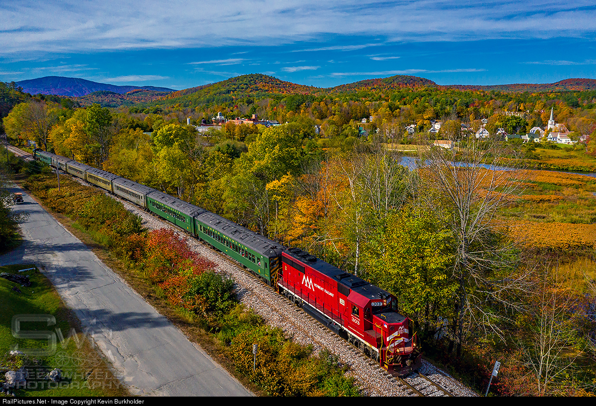 | With forecast rain and wind, the peak foliage in Vermont's Green Mountains made a last stand on October 8, amid the only sun forecast in a 10-day period. Vermont Rail System's Green Mountain Railroad Passenger Services Fall Foliage Flyer is seen heading eastbound into the Cavendish Gulf with gorgeous color abound for the hundred's of leaf peepers riding the passenger extra to take in. Vermont Railway GP40-2 303 is the east unit on the through-train MU consist, while GMRC Alco RS-1 405 is the west unit. |