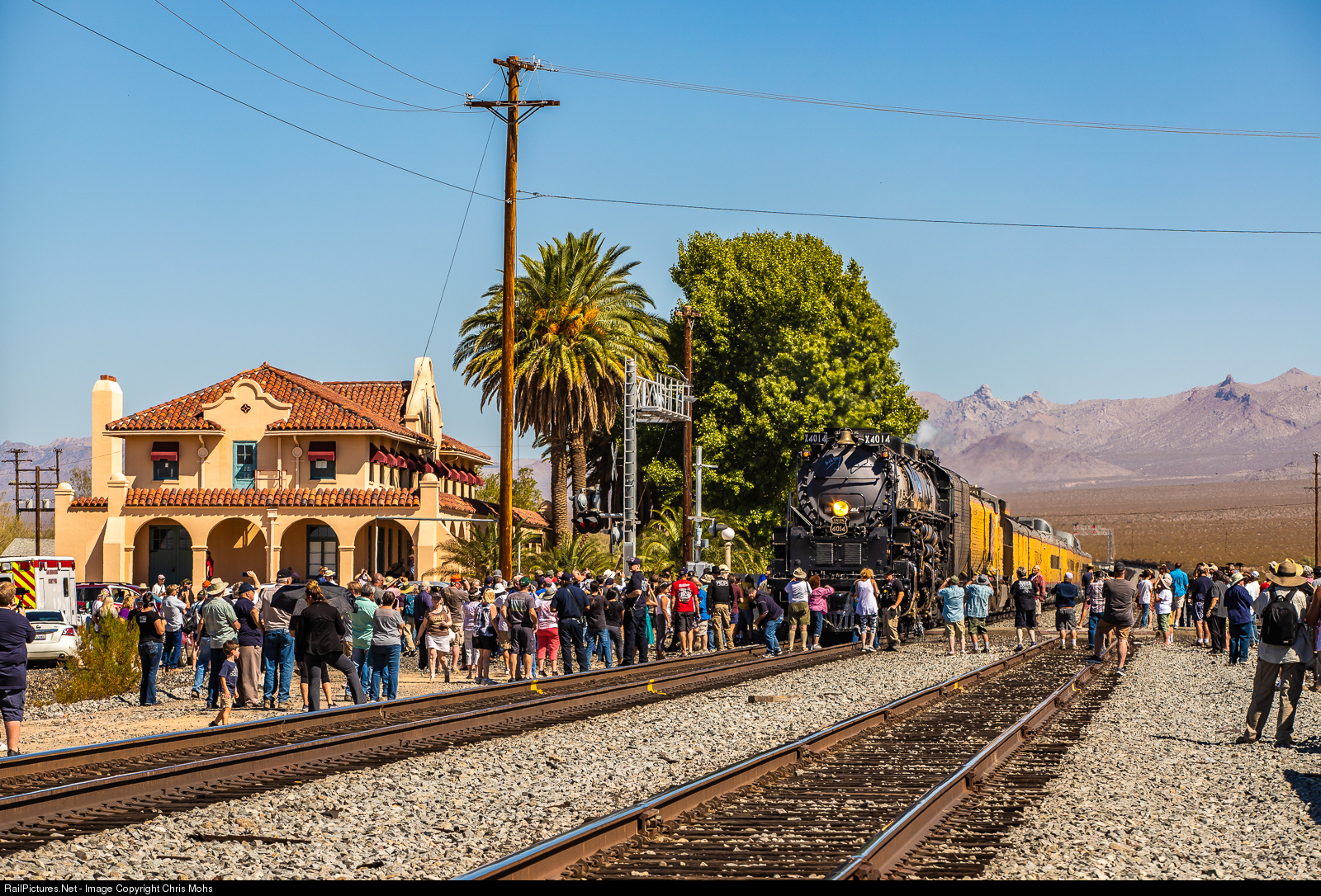 | After descending the steep grade of the western slope of Cima hill, UP 4014 is greeted by a huge crowd at the restored Kelso Station and helper crew quarters. In the steam era Kelso was a helper station supplying extra power over Cima Hill. |