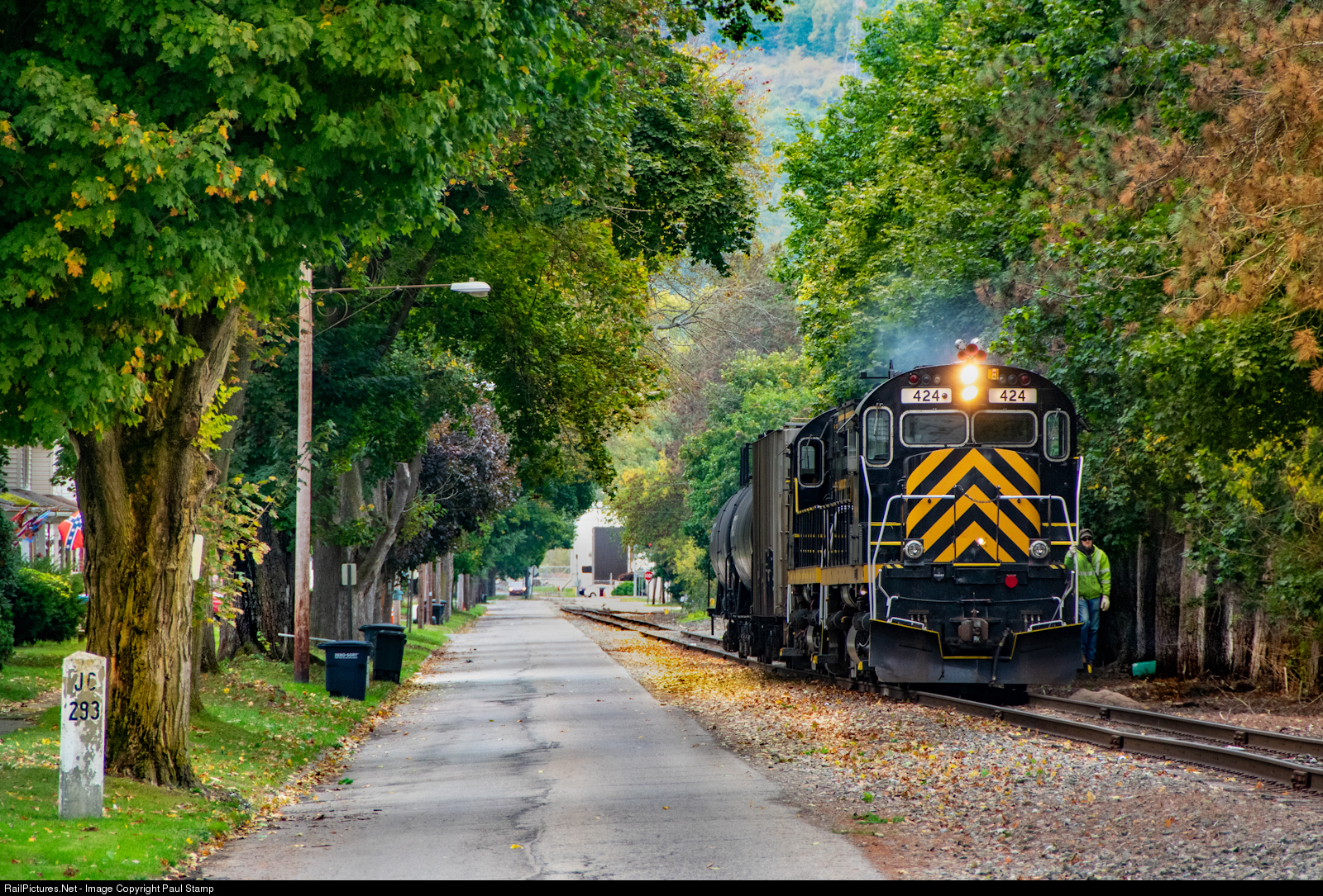 Livonia Avon and Lakeville c424 #424 now operating on the Bath and Hammondsport, has just picked up 3 cars from the B&H's interchange point with Norfolk Southern, and now prepares to head back north as it street runs along West Chemung St in Painted Post, NY.