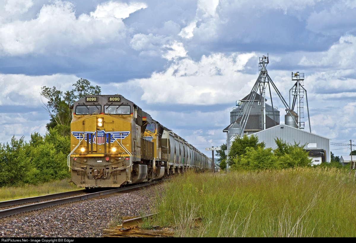 | UP 8090 leads a sand train west through Rusk, WI under changing skies. Not much to Rusk, mainly an old CNW station sign and the elevator. This was once C&NW's double track mainline to the Twin Cities from Chicago where the "400" once plied. |