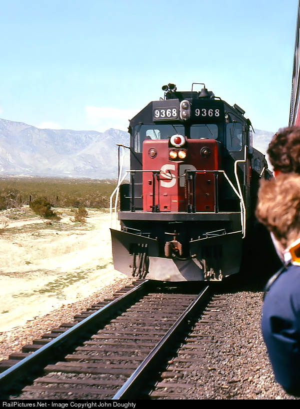 | As the Amtrak Pacific Railroad Society Mountain Outin Special heads westbound out of Mojave towards the Tehachapi Pass, we met many eastbound trains, including SP 9368. Every vestibule door was open and occupied by railfans taking photos or movies. Yes it was close quarters, and quite an experience passing freight trains at speed. |