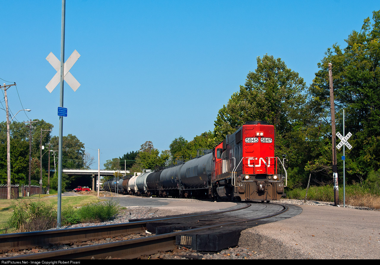 | A CN local shoves a cut of tank cars west along Industrial Ave in South Memphis. GTW 5845 had an interesting history, being built as P&LE 2052. Early in its GTW career it retained solid black P&LE paint with white GT logos added. It later wore standard GTW red/blue paint. |