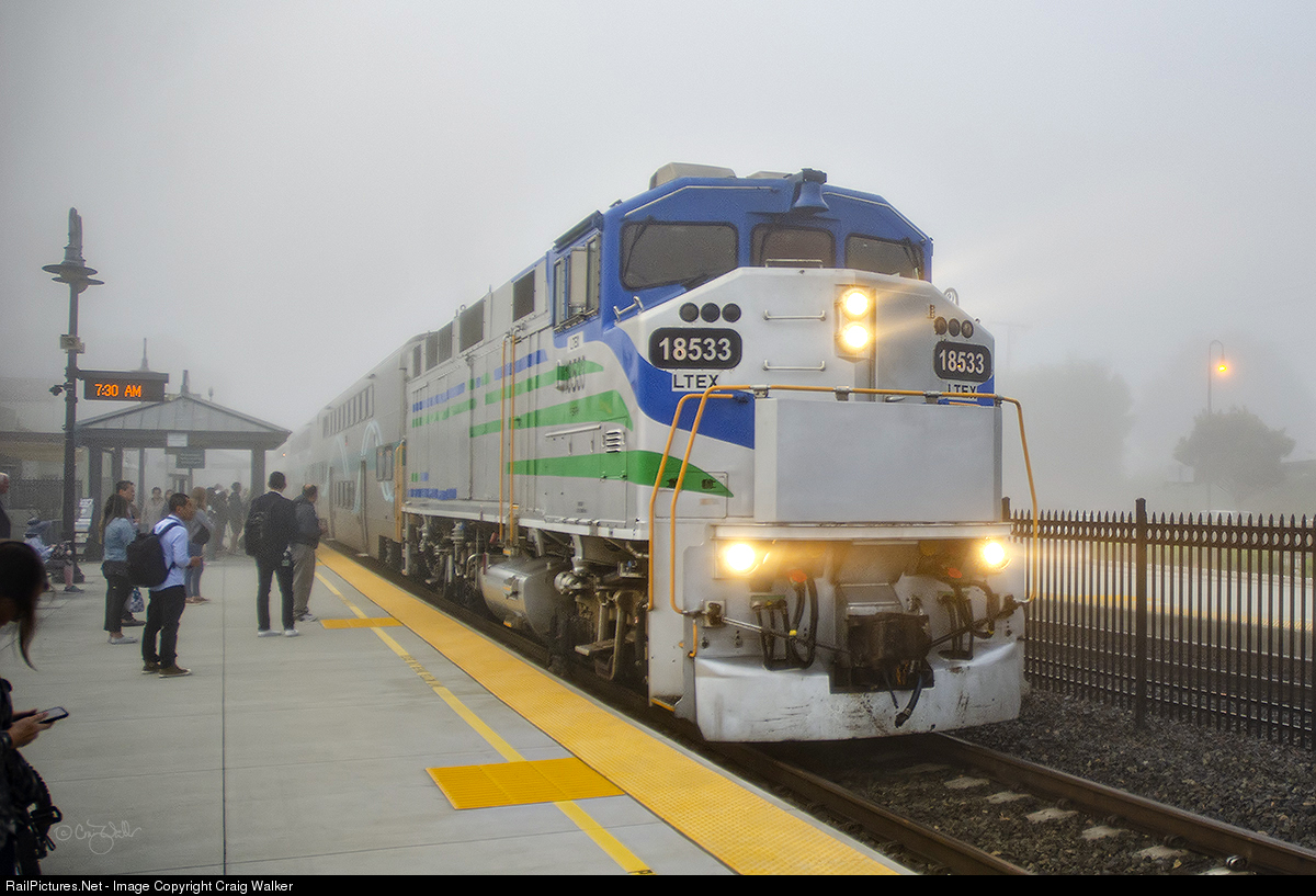 On a foggy October 8, 2019, morning, Metrolink train 683 blends into its surroundings as it arrives at the station in Orange, California. Leased F59PH LTEX 18533 (ex-RBRX 18533, nee-GO Transit 533) wears a primarily silver paint job (applied for an ill-fated commuter service in Michigan) and if it weren’t for the headlights, it would be hard to spot in the fog. This train originated in Irvine and is bound for Los Angeles.