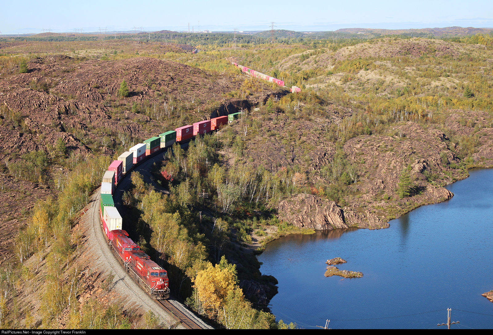 | Two GEs wind through the Canadian shield and the big granite rock cuts south of Romford with 100's train (Vancouver-Toronto). Baby Lake to the East and the long string of stacks in the late afternoon sun provide some colour in the otherwise rugged landscape. Romford was once a bustling junction where CP's Chalk River sub along the Ottawa River Valley connected its Montreal freight, passenger and interchange traffic to the trans-con line until it was rerouted fully via Toronto in 2011 . |