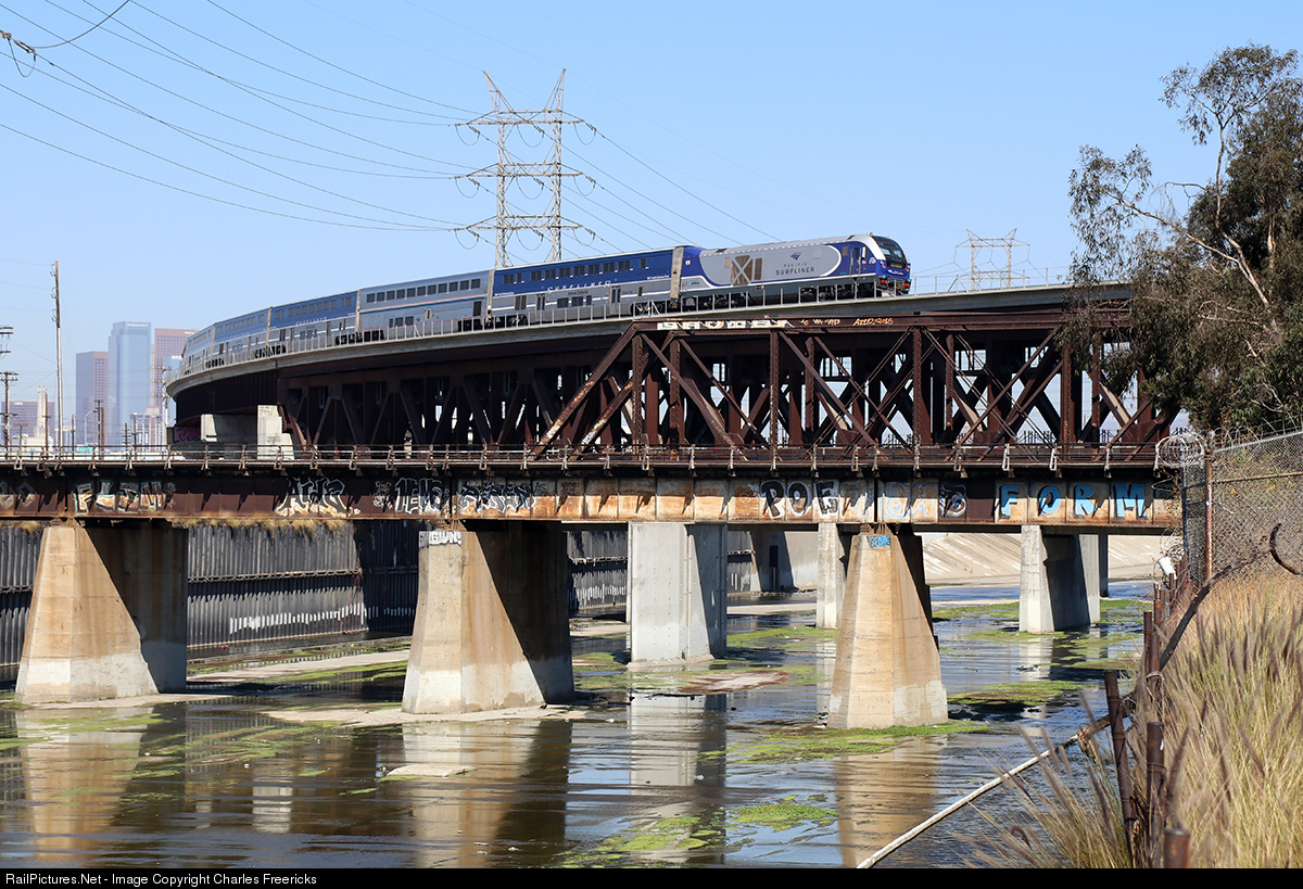 An Amtrak Pacific Surfliner shoves its way towards LA (looming in the background) as it crosses the LA River on the Redondo Flyover.