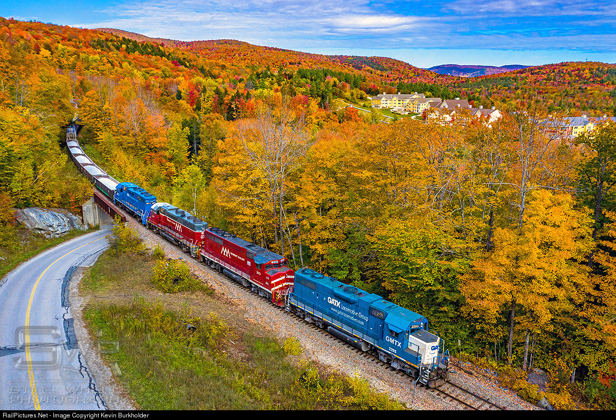 | Vermont Rail System’s GMRC train 263 adds patriotic colors to a brilliant peak fall foliage on the eastern slopes of the Green Mountains! While the western slopes are mostly brown and or bare in many areas on the GMRC Bellows Falls Subdivision, the colors peaked during the past few days from Summit to Gassetts, Vermont. 263 is seen with GMTX 2205 and 2674 book-ending the VTR 310 and 207. |
