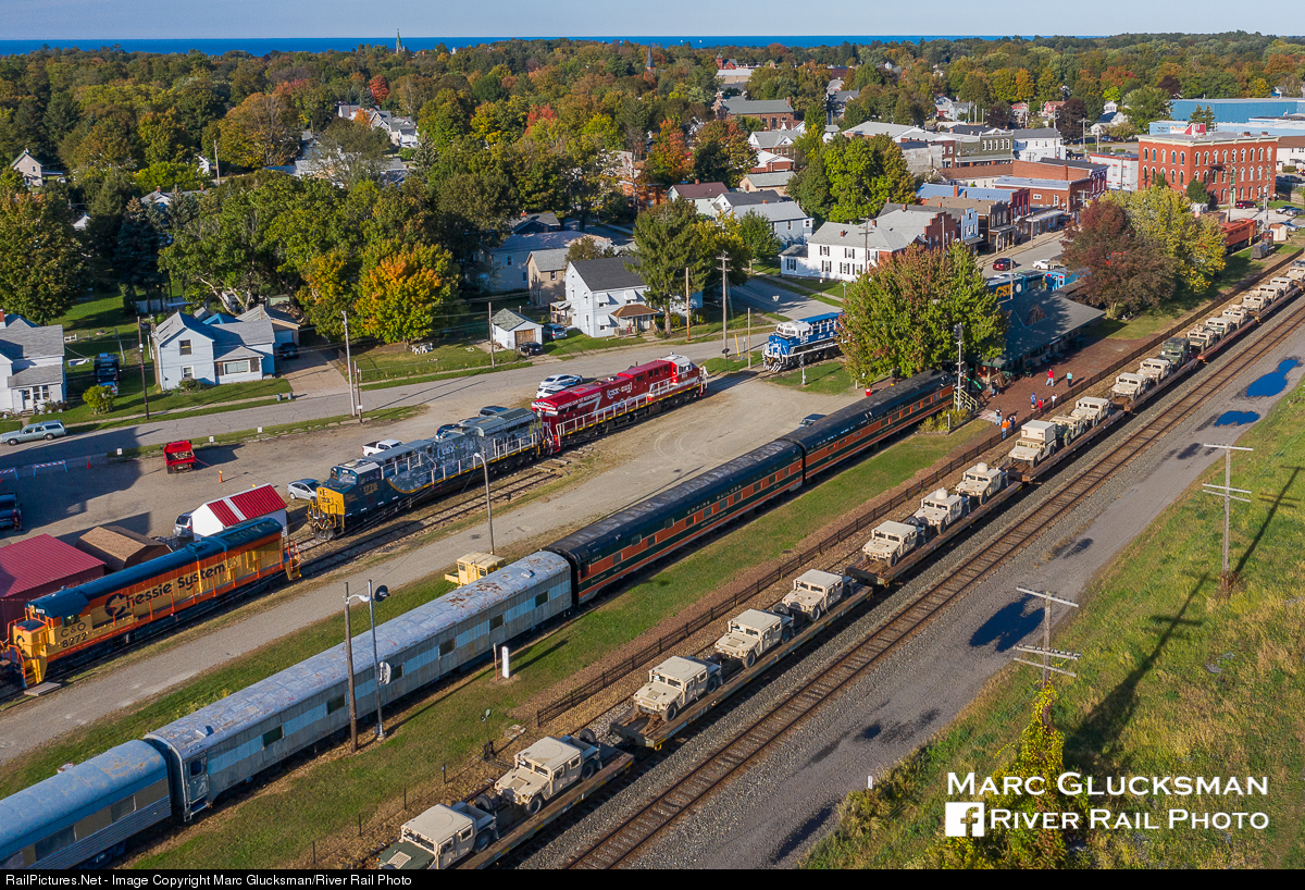 CSX W809-11 (CSX 4070, SD40-3) passed the Lake Shore Railway Museum in North East, PA on Friday, October 11, 2019 with a consist of military vehicles and equipment. CSX 1776 "Spirit Of Our Armed Forces" sits in the background, brought to the museum for the Lake Shore Railway Museum Honors our Heroes event.