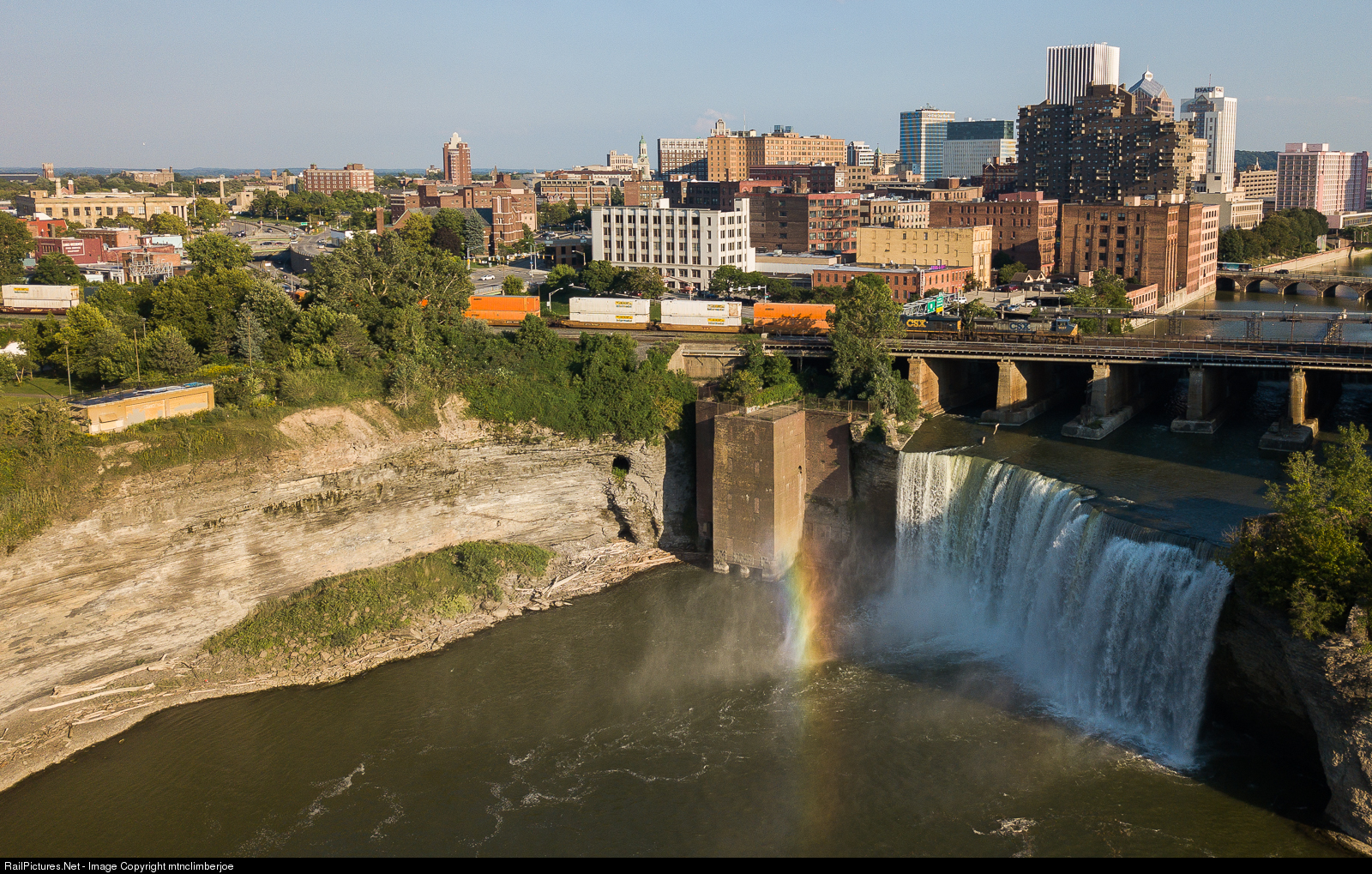 | CSX intermodal Q003 makes its way west through downtown Rochester, New York, crossing over the Genesee River at High Falls. The late evening sun creates a rainbow in the mist as the river drops 96 feet over the falls. |
