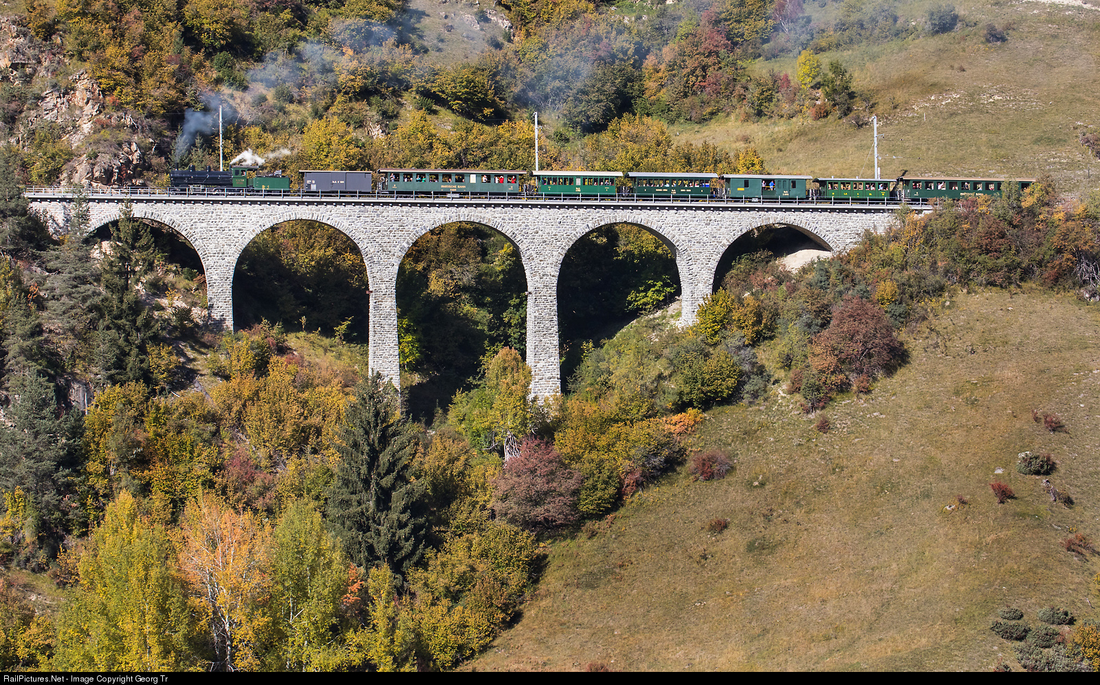 | 2-8-0 "Consolidation" G 4/5 # 108 "Engiadina" from 1906 is pulling the Engadine autumn steam train from Scuol-Tarasp back to Samedan over the 91 meter long Lumes viaduct near Ftan Baraigla. Despite the locomotive is hard working on the steady 2.5 % grade, there is little smoke visible only, because the coal from Wales/UK is burning excellent with few smoke. |