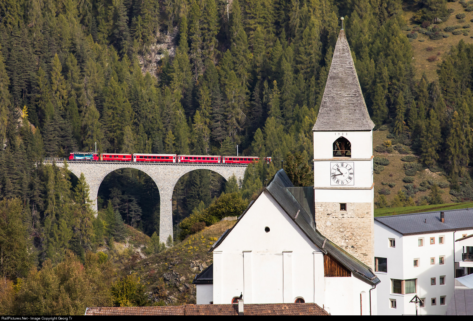 | Ge 4/4 II # 615 with publicity paint scheme for REPower is pulling the regional express 1232 from Scuol-Tarasp to Landquart (-Disentis) over the 136 meter long and 53 meter high Val Püzza viaduct near Ftan Baraigla. In the foreground the baroque trinity church of Tarasp Fontana from the 17th century. |