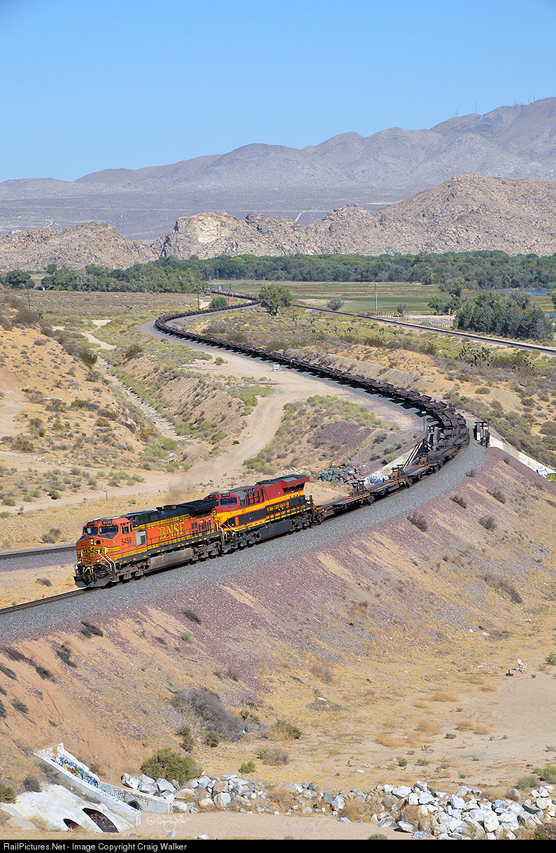 Threading is way around the S-curves on BNSF Railway's "natural crossover" at Frost, just south of Victorville, California, is a baretable train – usually something not very photogenic. But the empty spine cars snaking around the curves has some appeal, as does the pool power in the brief consist. Behind BNSF Dash 9-44CW 5459 is a Kansas City de México ES44AC (KCSM 4872). This train's symbol is B-LPKLAC1-05, a baretable operating from Logistics Park Kansas City KS to Los Angeles CA. Reportedly, this "natural crossover," which allows trains heading to Cajon Pass to cross over for left-hand running when they descend Cajon Pass (the grades work better with left-hand running on Cajon), may be removed soon as this area is slated for triple track. And yet another railroading icon will disappear.