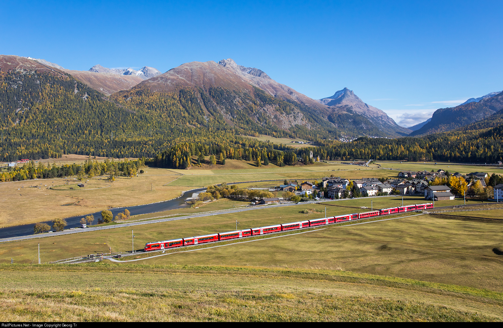 | Beautiful autumn colors in the Engadine. "Allegra" ABe 8/12 # 3508 is shoving the ALVRA push pull train Interregio 1156 from St.Moritz to Chur between Celerina and Samedan. The leading cab car At is followed by the permanently coupled 6-car ALVRA trainset and a second class standard car type II as reinforcement, then the Allegra railcar. The view goes in the direction of Pontresina and the Bernina pass, with the San Gian church from the 15th century on a little hill in the plain. In the background in the middle 3262 meter high Piz Languard and more right 3167 meter high Piz Albris. On the left the white builing on the mountain is Muottas Muragl hotel and restaurant on 2454 meter a.s.l. |