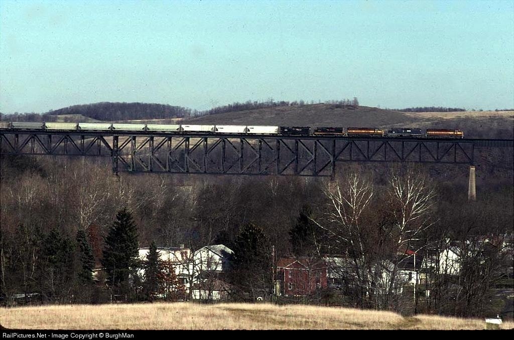 An eastbound grain train crosses the Wheeling's Banning Viaduct. WC 6618 on lease to W&LE.
