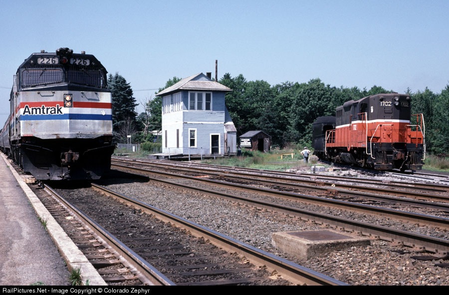 | Amtrak's The Fast Mail stopped on the ex-New Haven Shore Line. Providence & Worcester GP-9 1702 was on the Connecticut Valley RR (line goes north to Essex). |