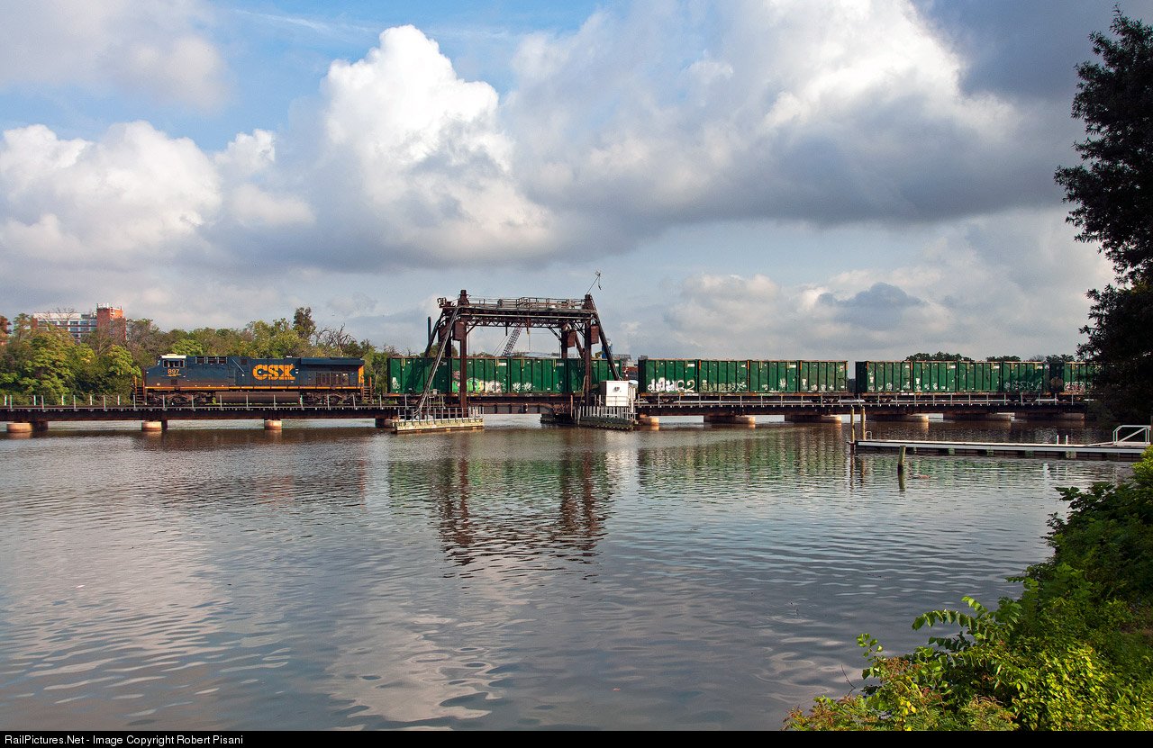 | A westbound CSX train led by a single GEVO (with another in DPU mode further back in the train) crosses the Anacostia River in Washington DC on the Capitol Sub. |