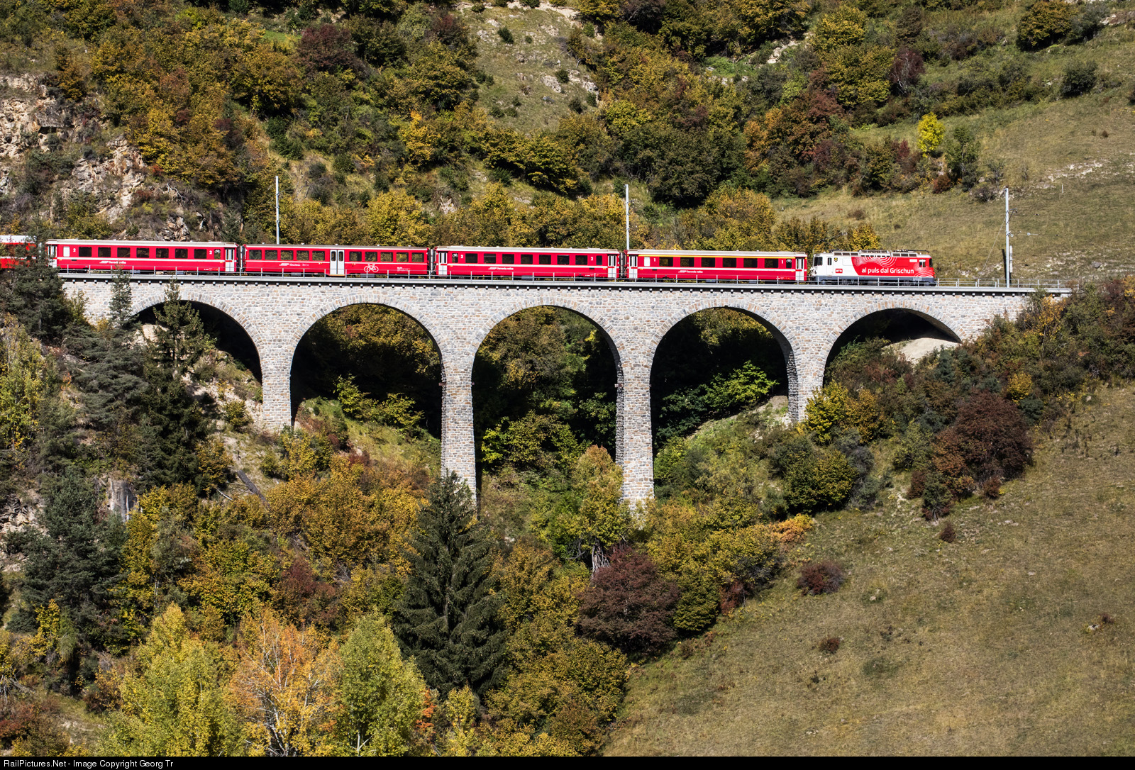 Ge 4/4 II # 633 "Zuoz", last of the series, with publicity paint scheme for "Radiotelevisiun Svizra Rumantscha" (broadcast and television in rhaeto-romanic language) since 2011, is pulling regional train 1936 from Pontresina to Scuol-Tarasp over the 91 meter long Lumes viaduct between Ftan Baraigla and Scuol-Tarasp. Third car is WS # 3912 for the transport of bycicles, rebuilt in 2001 from the second class car B # 2338 from 1956.