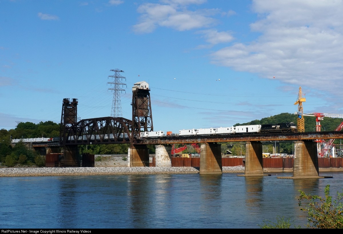 A long train of MOW equipment crosses over the Tennessee River into Chattanooga.