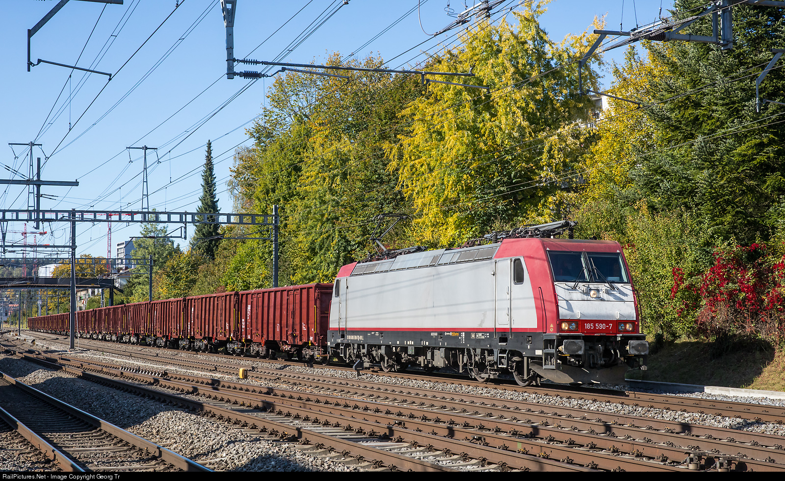 Bombardier TRAXX F140 AC2 185 # 590 of the Beacon Rail Leasing Ltd., London, built in 2008, rented to the austrian LTE (LTE Logistik- and Transport-GmbH, Graz), running for the EDG (Eisenbahndienstleister Gmbh, Thayngen), with the 1400 ton import sugar beets train 44085 from Basel via Koblenz-Bülach-Winterthur to Islikon (- Swiss Sugar works Frauenfeld), between Winterthur and Oberwinterthur. The Eas cars are from the slovakian Cargo Wagon a.s. in Bratislava and can load up to 57 ton each.