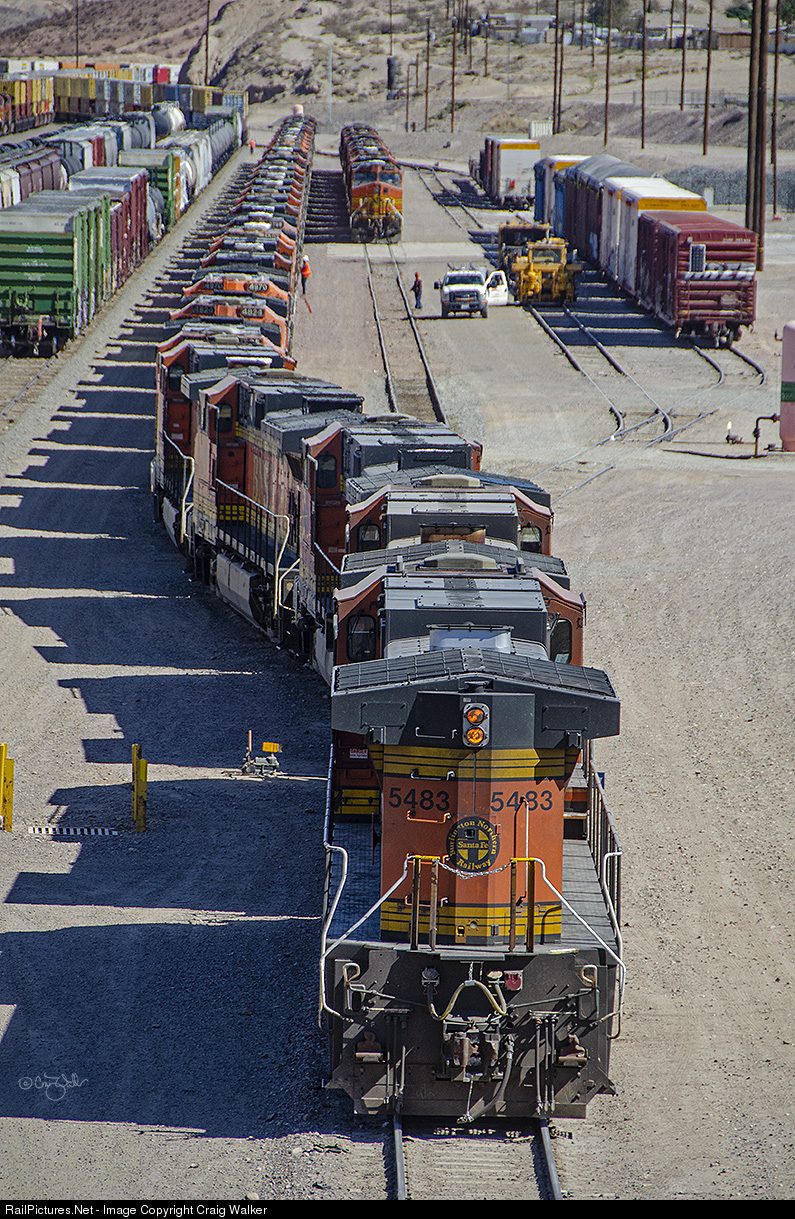 At BNSF Railway’s yard in Barstow, California, are strings of excess locomotives. The string seen in this photo is about half of the locomotives in storage, many of them being placed there in the last week or two. They all appeared to be Dash 9-44CWs, and anywhere from 21 to 19 years of age. Curiously, in the string pictured here, the two Dash 9s closest to the camera, 4880 and 5483, were still idling for at least two days, although the rest of them were not. Oddly, BNSF 5483’s rear headlight was illuminated as well. At BNSF Railway’s yard in Barstow, California, are strings of excess locomotives. The string seen in this photo is about half of the locomotives in storage, many of them being placed there in the last week or two. They all appeared to be Dash 9-44CWs, and anywhere from 21 to 19 years of age. Curiously, in the string pictured here, the two Dash 9s closest to the camera, 4880 and 5483, were still idling for at least two days, although the rest of them were not. Oddly, BNSF 5483’s rear headlight was illuminated as well. (So much for the myth that the economy is doing well in 2019. And this is peak shipping season, too.)