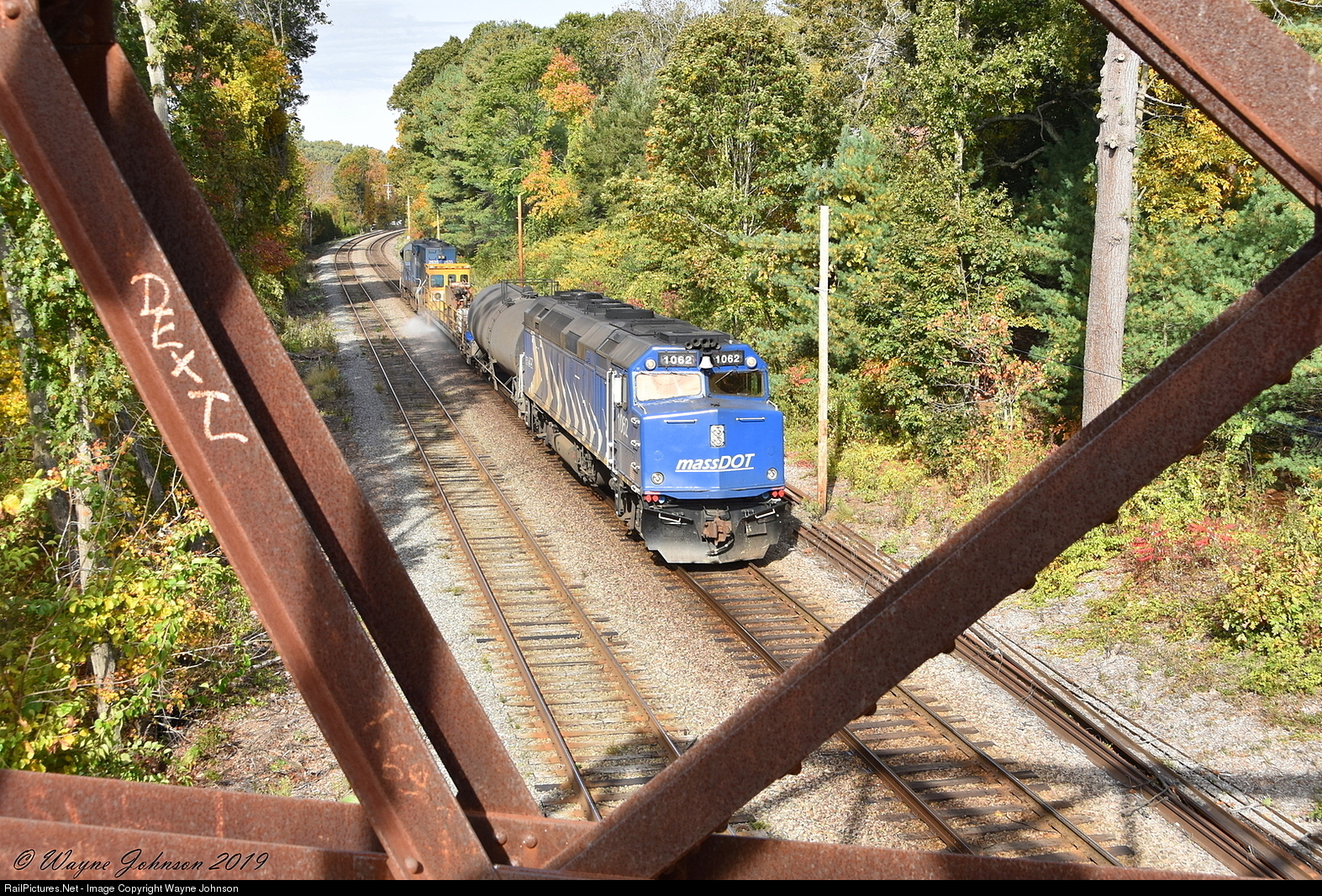 During every Fall, wash trains are run throughout the commuter rail system to keep the tracks clear of residue. A high pressure jet of water is sprayed onto the railhead to clear leaf residue away, allowing for better traction. Here, a Wash-Extra heads West to Wachusett under the former Central Mass Branch bridge, which hasn't been used since the Boston & Maine era in the early 80s.
