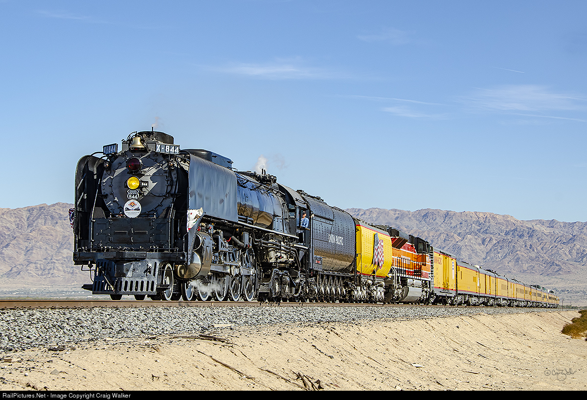 Speeding across the Union Pacific's Yuma Subdivision on November 17, 2011, UP 4-8-4 844 has been touring the American southwest in order to help celebrate the upcoming centennials of New Mexico and Arizona. Having completed its visit to these two 99-year-old states, the engine has entered California and is passing through Bombay Beach, at 233 feet (68 m) below sea level, the lowest community in the United States (making this the lowest elevation of any railroad in the US as well). This train, with UP's Southern Pacific "Heritage" SD70ACe in the consist, is making the long trek back to its home in Cheyenne, Wyoming.