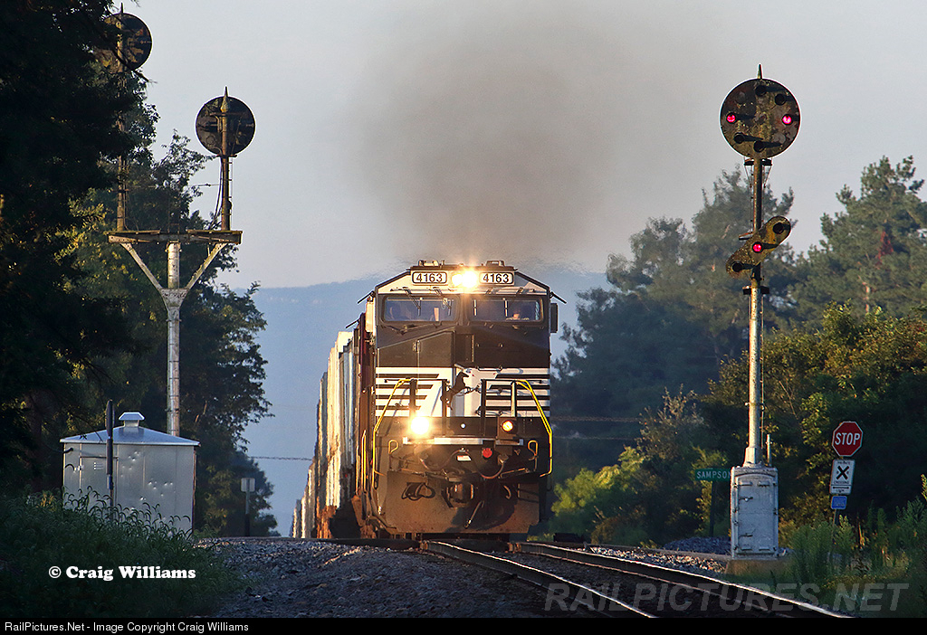 The NS Roanoke District thru the Shenandoah Valley between Roanoke and Shenandoah still has original N&W era signals at the control points. Here we have hotshot train #202 rolling thru the north end of the siding at Sampson not long after sunrise. The train is carrying expedited traffic from Marion, AR, to Harrisburg, PA, and seems to be an early morning train on this line thru here. Sampson is a 5800 foot siding that is 28 miles south of Shenandoah, the next crew change for 202.