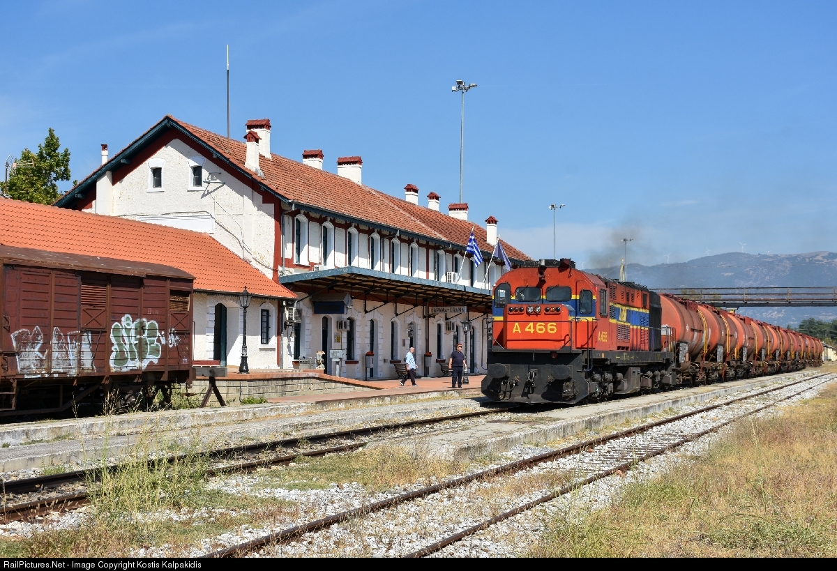| The freight train 80611 from Alexandroupoli headed MLW A-466 with empty fuel tank to Thessaloniki, at the Drama train station. |