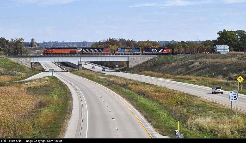 CN L510 crosses over US-151 in Fond du Lac, WI with a colorful lashup led by BLE 901.
