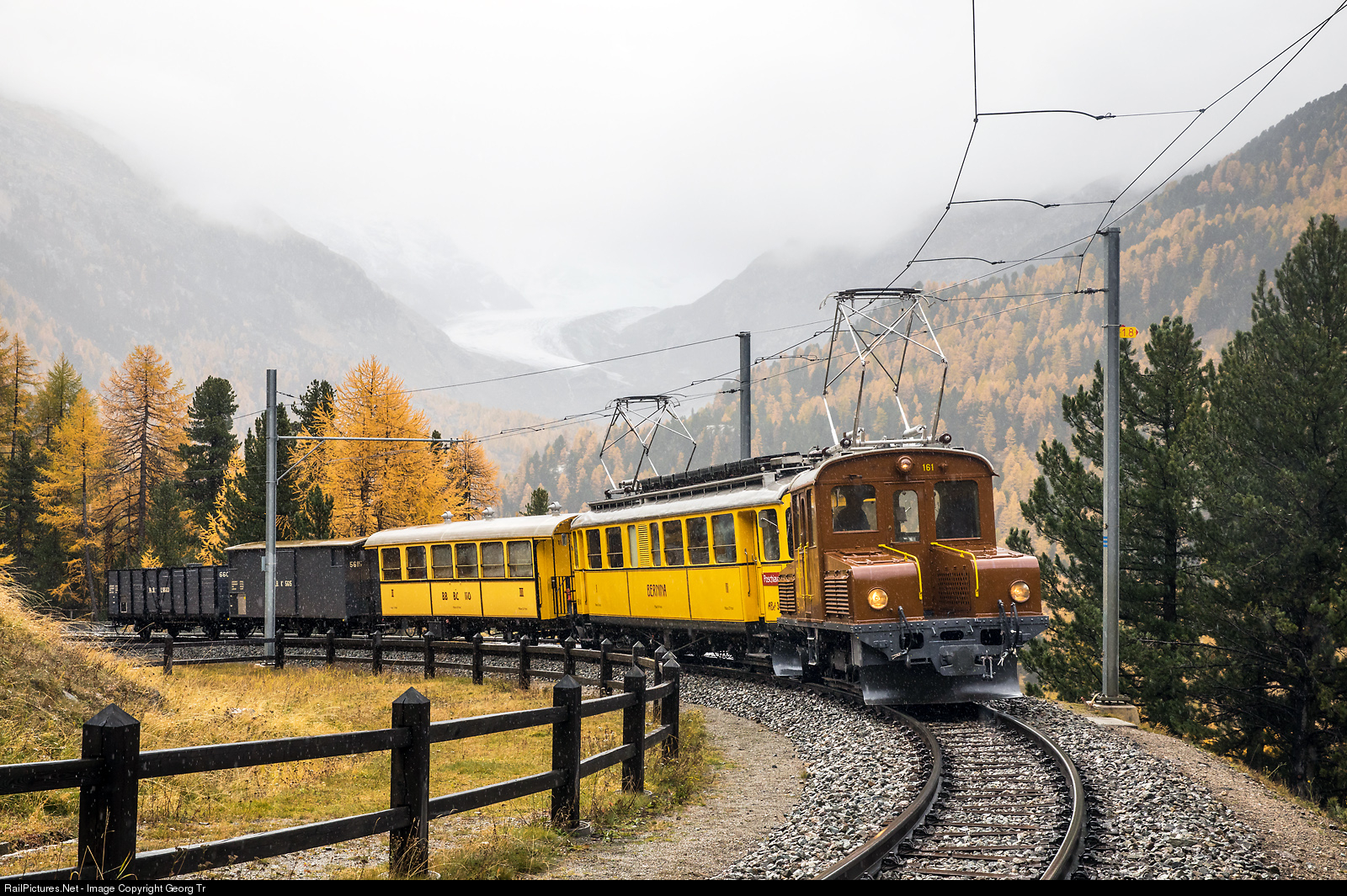 | The "Asnin" (little donkey) Ge 2/2 # 161 from 1911 and the railcar ABe 4/4 # 34 from 1908 are rounding the Montebello curve between Morteratsch and Bernina Suot with a short mixed train. All historic vehicles are more then 100 years old. A "Meier's walking tour" photo charter train. |