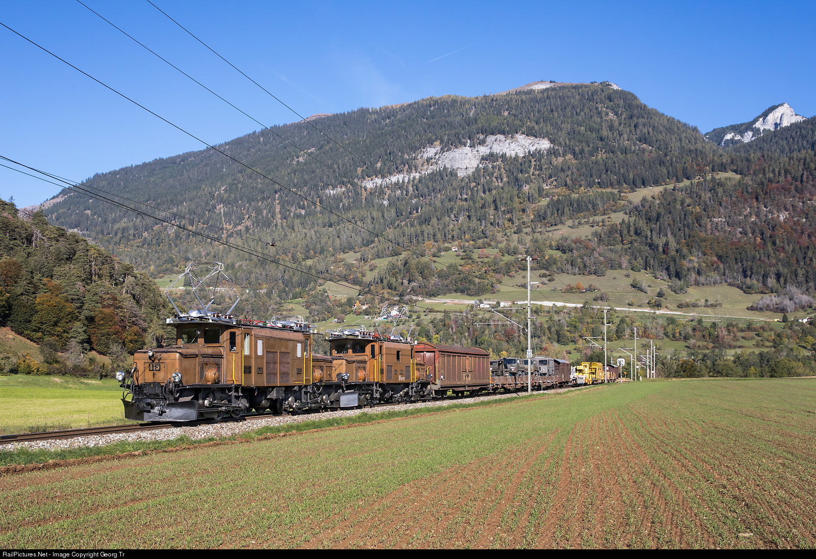 | The "Rhaetian Crocodiles" Ge 6/6 I # 415 and # 414, built in 1929, are pulling a photo freight on the Albula line between Reichenau-Tamins and Bonaduz. A RM photo charter. |