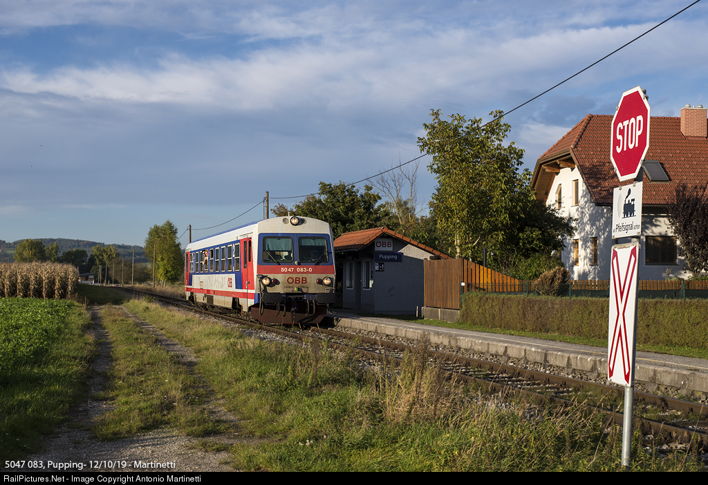 The railcar passes at low speed Pupping "flag" stop, on its way toward Wels.