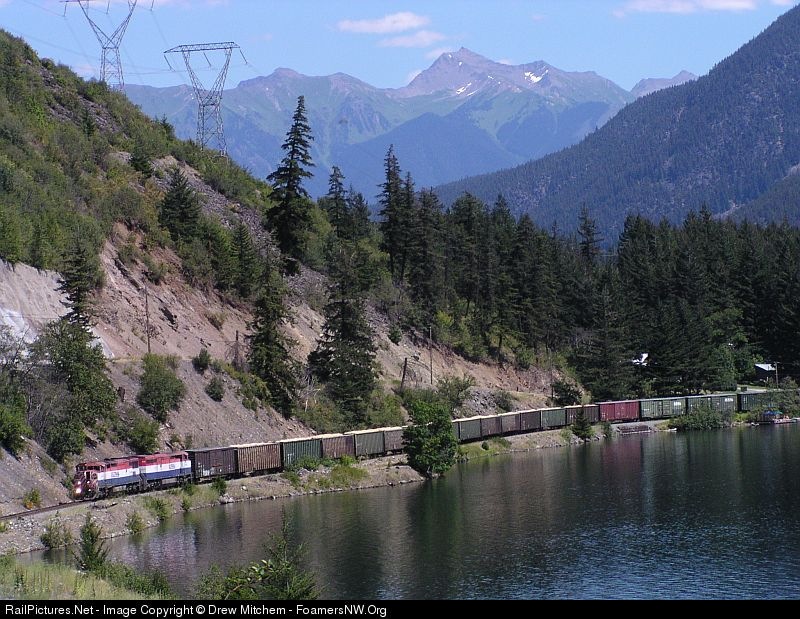 BC Rail 4610 cruises by a lake and mountain scene just south of D'Arcy