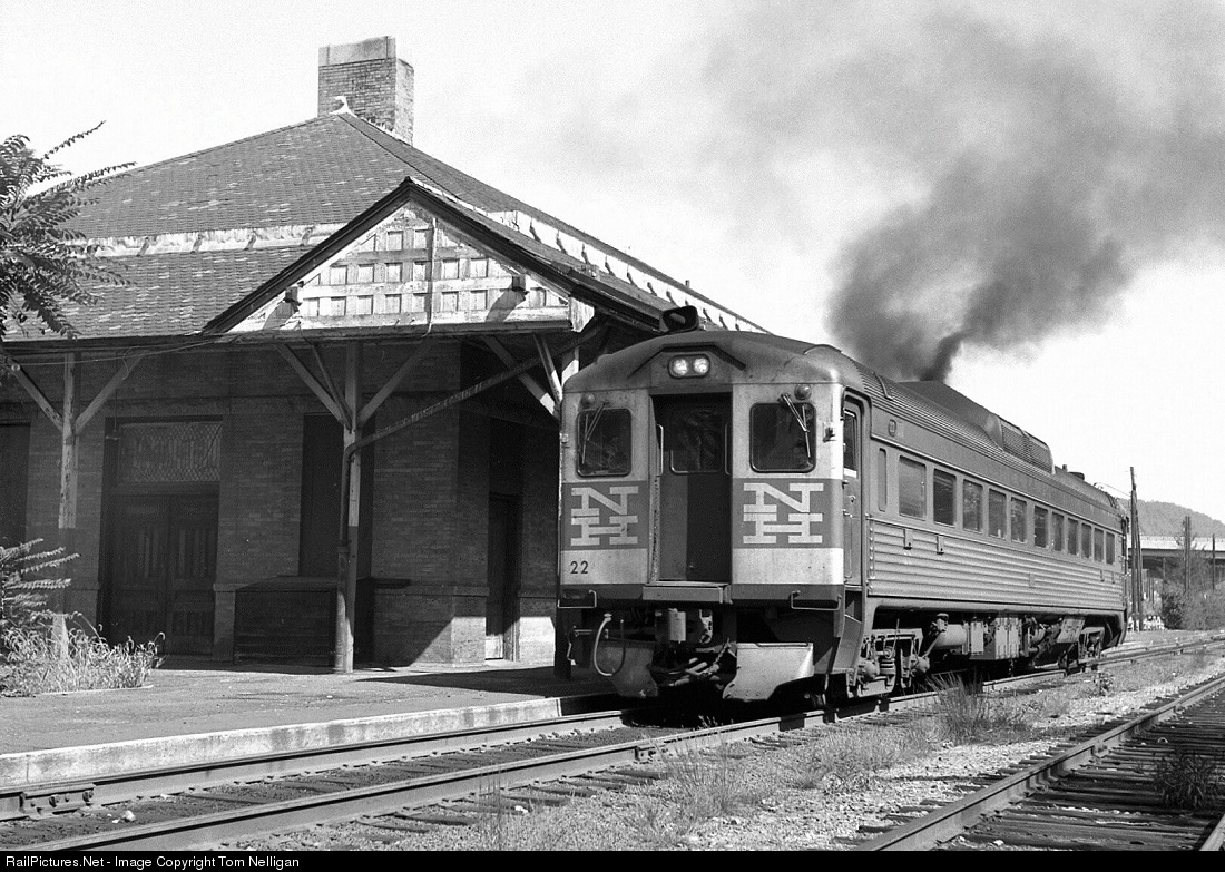 | In the 1960s, Budd RDCs covered all passenger service on the New Haven's Naugatuck Valley branch. Car 22 smoked things up as it departed Seymour, CT, on its way from Waterbury to Bridgeport. A couple years later the 1898 station here would be torn down to make way for parking spaces and replaced by a small shelter. |