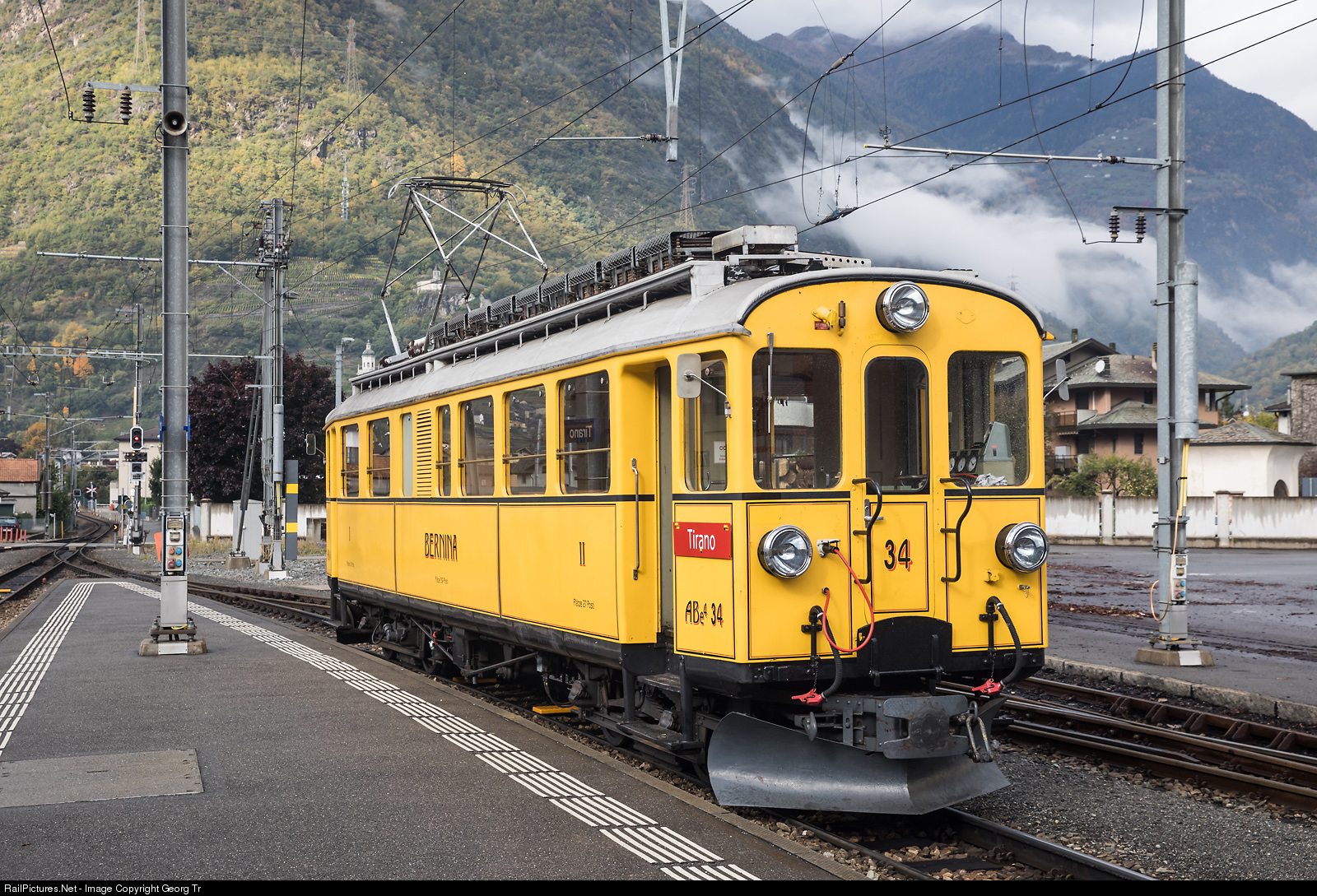 | Railcar ABe 4/4 # 34 of the Rhaetian Railway reached Tirano, final station of the Bernina line. this vehichle was built in 1908 by SIG and SAAS as BCe 4/4 # 4 for the then independent Bernina Railway. Large rebuilding in 1947 and painted in green/cream. From 1962 to 2001 the railcar was in red colors, since then yellow again as historic vehicle like when it was built.There is a similar railcar of the same series, ABe 4/4 # 30. |