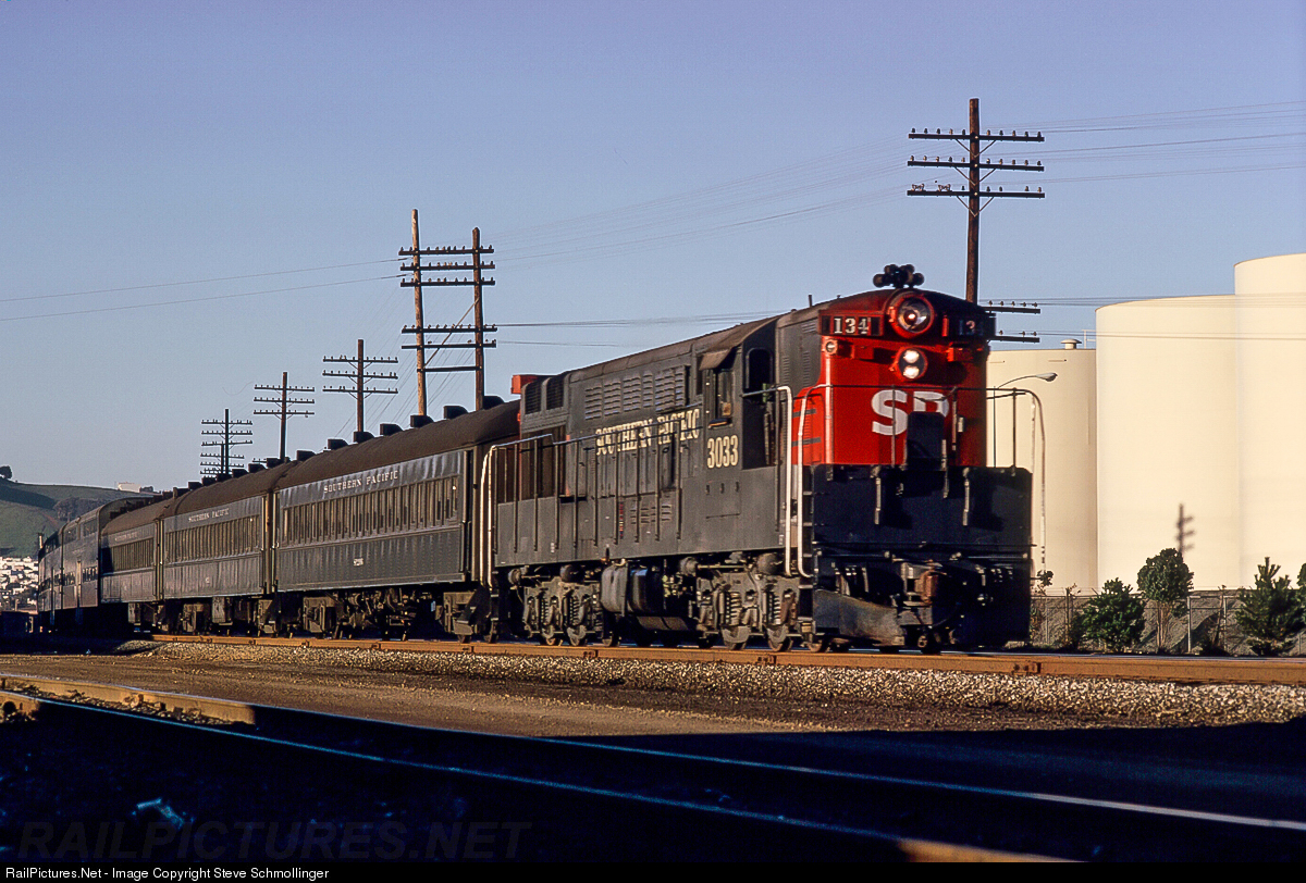 | A member of SP's weekend commute fleet heads compass south through Bayshore, CA, on its way to San Jose. |