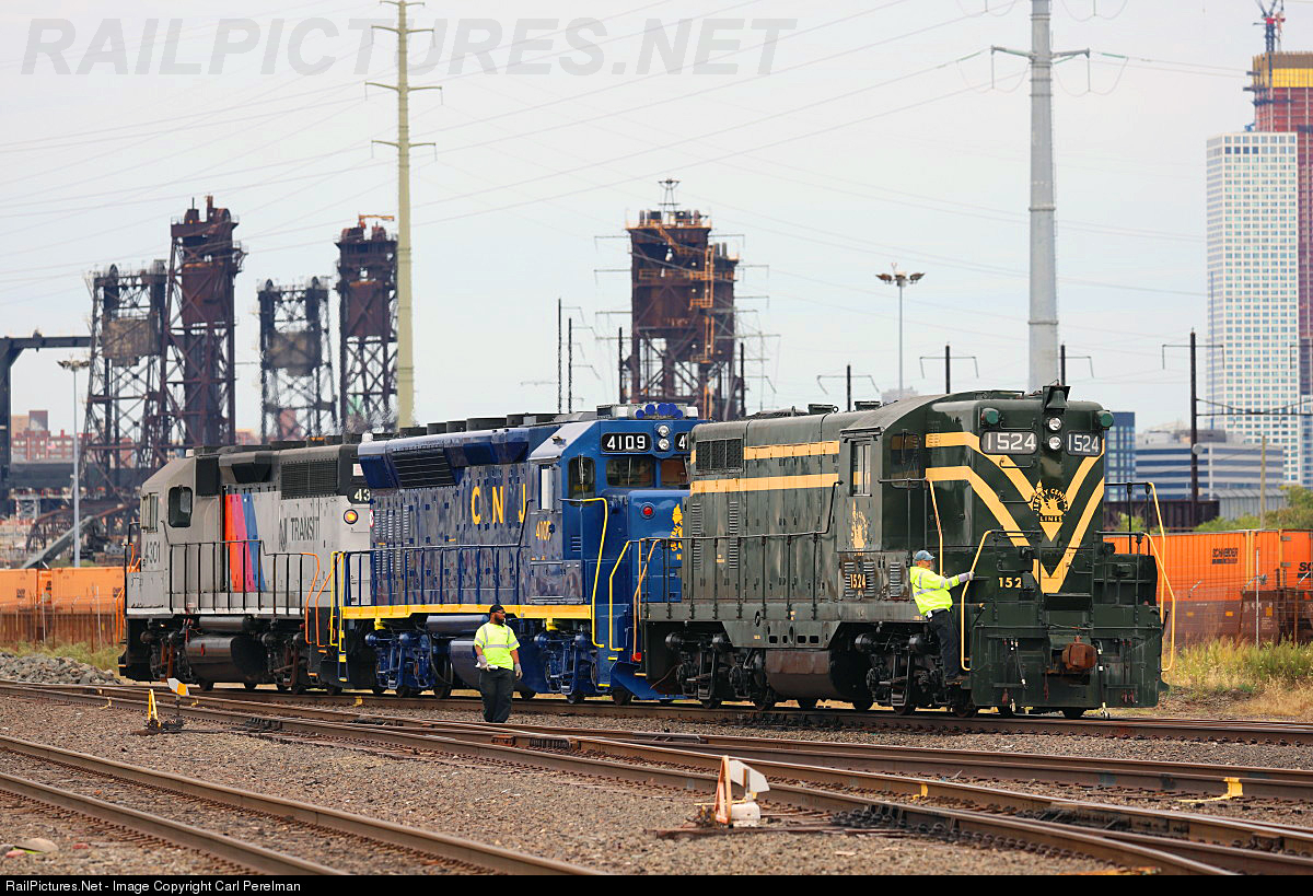 An NJ Transit yard crew is shuffling URHS's CNJ GP7 1523 and NJT's CNJ GP40PH-2 4109 in preparation for a media event. In the background are a trio of historic Hackensack River crossings, from right to left, Hudson & Manhattan, PRR, and WittPenn lift bridges.