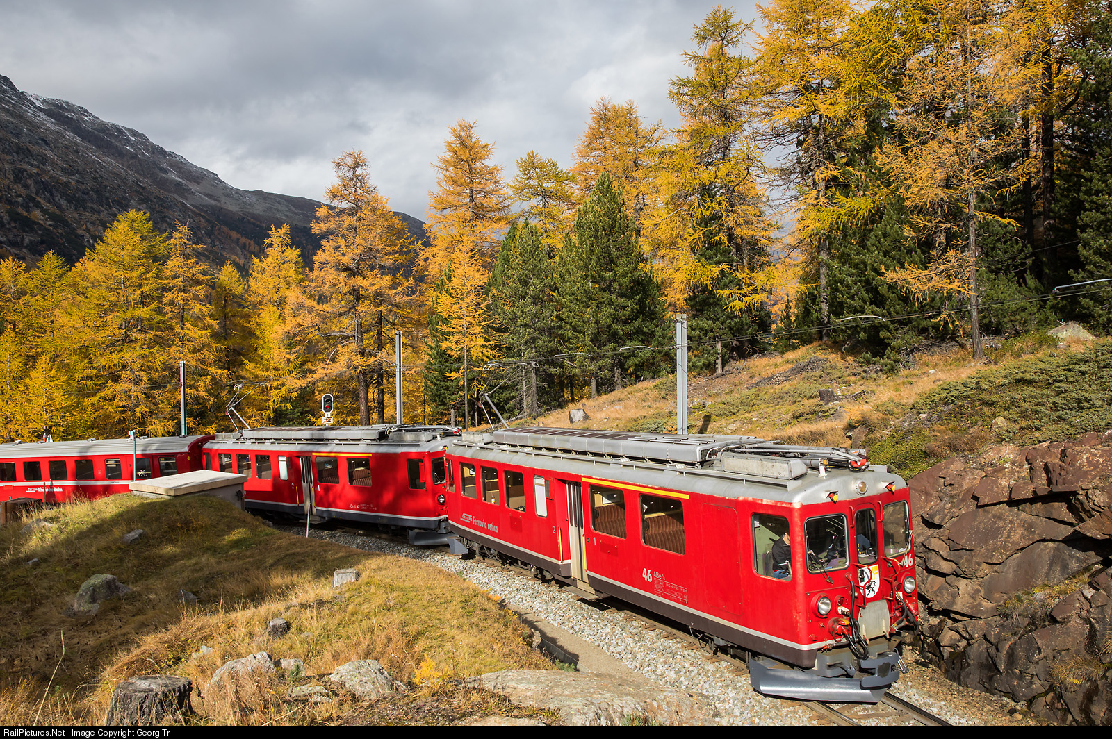 | Railcars ABe 4/4 # 44 and # 47 in multiple traction are pulling a photo charter train in the Montebello curve on the Bernina line. This railcars are not in regular passenger service any more, but used by the infrastructure department. |